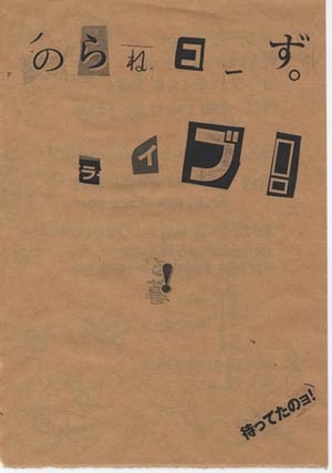 『東京音図 展覧効果』 期間/ 2005年8月16日(火)〜22日(月) 時間/ 11:00〜18:30(最終日は16時まで) 場所/ 月光荘画材店 画室5 中央区銀座7-8-15新橋会館別館ビル3階 TEL 03-3571-1116(会期中のみ直通) 月光荘画材店 TEL 03-3572-5605 入場無料 参加者名/ あかばねやすこ 朝日太一(ジーニアス) いわきりなおと(こどもinc) オオキトモユキ 東直子(短歌)+広田栄美 (書) 詳細/ http://www11.plala.or.jp/ONZUKAN/tenran.html *月光荘は与謝野鉄