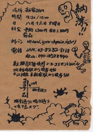 MC:マメ山田 映像出演:大柴祐介 日時: 2005年08月16日 開場18:30/開演19:00 2005年08月17日 開場14:30/開演15:00 2005年08月17日 開場18:30/開演19:00 場所:初台Doors 東京都渋谷区本町1-2-1 榎本ビルB1、B2 料金:前売¥3800(1ドリンク込) 当日¥4000(1ドリンク込) 1公演入場者200人限定 チケット:チケットぴあ Pコード予約:0570-02-9966(10:00〜23:30)Pコード:205-499 問い合わせ:フィルムメイカーズ(株) URL: http://homepage2.nifty.com/Film-Makers/ 製作:フィルムメイカーズ(株)/ 音楽制作:s