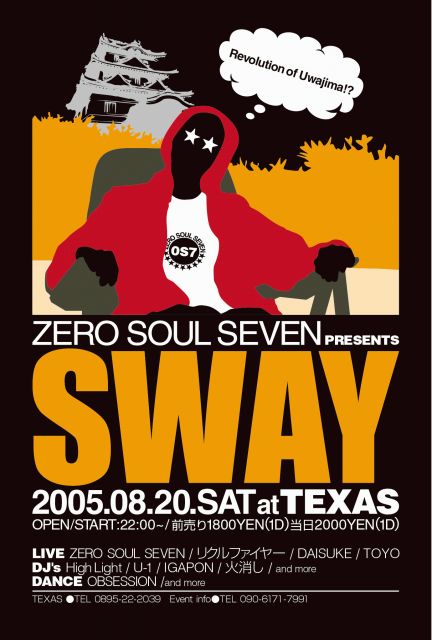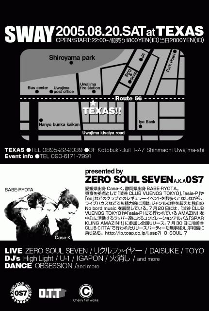 いにイベントの詳細が決定しました! みんなで乾杯しましょう。 ZERO SOUL SEVEN PRESENTS ■SWAY■ 2005.08.20.SAT at TEXAS OPEN/START:22:00~ /前売り1800YEN(1D )当日2000YEN(1D) LIVE ZERO SOUL SEVEN / リクルファイヤー / DAISUKE / TOYO DJ's High Light / U-1 / IGAPON / 火消し / and more DANCE OBSESSION /and more TEXAS ●TEL 0895-22-2039 Event info●TEL 090-6171-7991 〜ZERO SOUL SEVEN〜 愛媛県宇和島市出身のCase-K、静岡県出身BABE-RYOTA。 東京を拠点として「渋谷CLUB VUENO