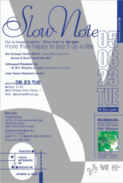 「Living in the music - 音楽が聴いていたい!いつもそばにいる君と同じように当たり前に心地よい感じ。食事の後のゆるい時間、楽しい会話とちょっとスペシャル。踊って、感じて、いい感じにお酒を飲めば、その日はそれでもう満足!!週末に限られた非日常的な結果ではなく、素晴らしい人生の経過として毎日をエンジョイする人へ、あたたかく身体を包む音楽と、自由な空間でお楽しみ下さい。more happy to jazz it up a little..」