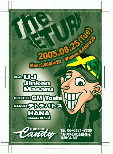 UJ's The RETURNがミナミのニュースポットstudio CANDYでスタートします! 出演者は完璧なくらいのUJ's Familyです! 久しぶりの開催なので、今回出演していないFamilyも 集まる予定です! 来れる人も来られない人もコメント残してくださいね! DJ---UJ、Jinken、Masaru Guest DJ---GM Yoshi Dance---テトラパトス Reggae Dance---HANA info.06-6121-7300 大阪市中央区東心斎橋1-18-27 東急ビルB1F studio CANDY