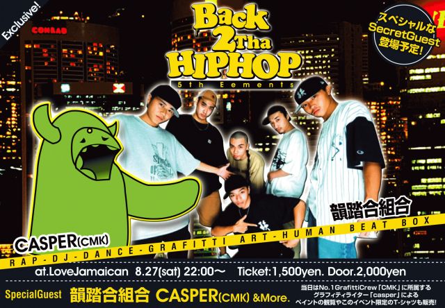 HIPHOPを見つめ直そう! HIPHOPの5大要素の RAP、DJ、DANCE、GRAFFITI、HUMAN・BEAT・BOX を取り入れたイベントです。 -------------------------------- 現在のゲストは DJ JifRock(DMC) 韻踏合組合 CASPER.from.CMK (GRAFFITI) CASPERのライブペインティングあり! DanceShow:楽阿見(愛媛)、Lady-Phat、Little-L、Revibe その他、ゲスト有り! サイファーやブラックブック披露などの交流も出来ます! ---------------------------------------------- チケットで入場の方、先着でCDプレゼント!