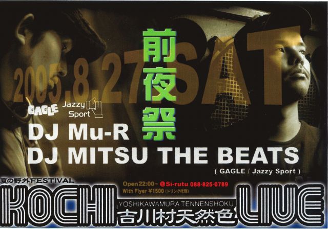 ≪KOCHI吉川村天然色LIVE≫の前夜祭が開催決定!!! 『DJ MITSU THE BEATS』と『DJ Mu-R』を招いての豪華すぎる一夜☆ 夏の野外フェスの前日はドープなクラヴイベントでアゲていこう!!! Guest DJ DJ MITSU THE BEATS (GAGLE/JAZZY SPORT) DJ Mu-R (GAGLE/JAZZY SPORT) Support DJ U2K (JUICE)/Shoko(Super FRI)/SAGO SOUL(華麗なる週末/KICKIN' JAZZ)/and more・・・ START 22:00〜END 4:00 With Flyer \1500(ドリンク代別) @door \2000(ドリンク代別) ※《天然色LIVE》、または《Back 2 The Hiphop
