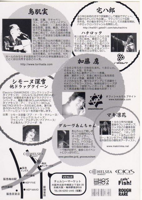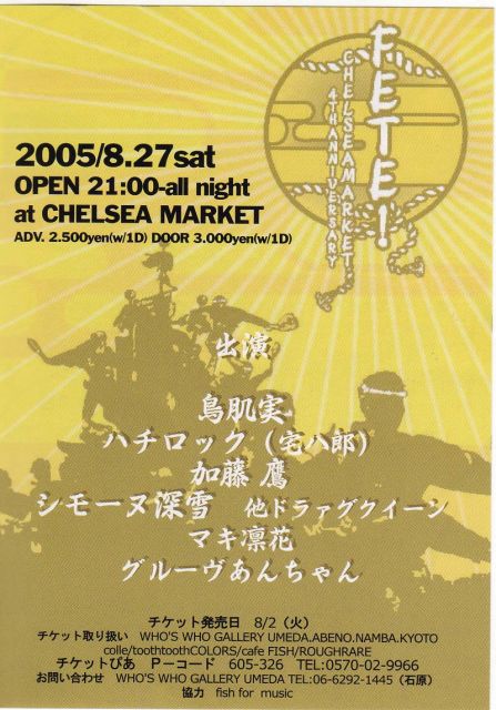 <イベントの告知失礼致します> 大阪梅田HEP FIVE近くのCHELSEA MARKET内にてCHELSEA MARKET 4周年イベントが盛大に行われます! トークあり、ライブあり、DJタイムあり、ショーありで 朝方5時までのオールナイトイベントです。 美味しいお酒を飲みながら、夏の終わりを豪華出演アーティストと楽しく過ごしませんか! 詳しい出演時間帯など、決まり次第アップします。 ★FETE!CHELSEA MARKET 4th Anniversary ■Pコード:605-326 (チケットぴあ) ■2005年8月27日