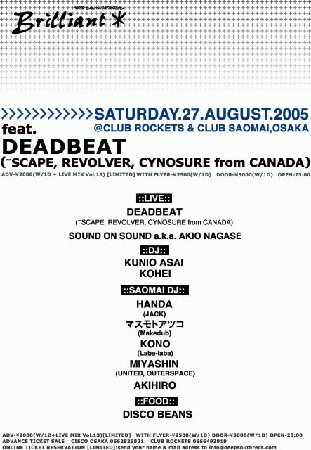 SATURDAY.27.AUGUST.2005 @CLUB ROCKETS & CLUB SAOMAI OPEN-23:00 ADV- 2000(W/1D+LIVE MIX Vol.13) W/F- 2500(W/1D) DOOR-3000(W/1D) ●LIVE DEADBEAT(~SCAPE,REVOLVER,CYNOSURE from CANADA) http://www.techno.ca/deadbeat/ http://www.scape-music.de/ SOUND ON SOUND a.k.a. AKIO NAGASE ●DJ KUNIO ASAI (http://www.deepsouthrecs.com ) KOHEI ●SAOMAI DJ HANDA(JACK) マスモトアツコ(Makedub) KONO(Laba-laba) MIYASHIN(UNITED,OUTERSPACE) AKIHIRO ●FOOD DISCO BEANS