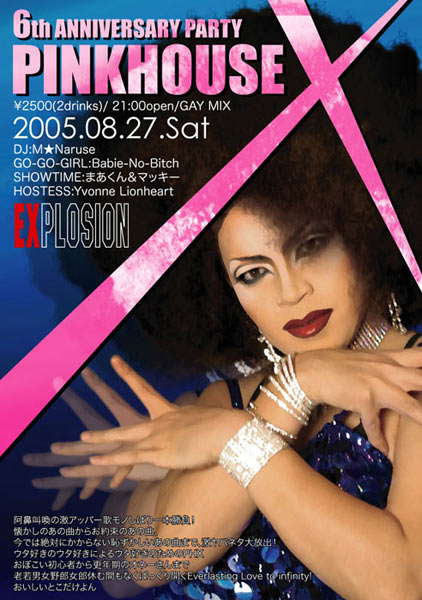 そして6周年企画第2弾!! 第2のホームグラウンド大阪でも開催!! *** GAY MIX *** venue : EXPLOSION open : 21:00- DOOR : \2500/2d DJ:M★NARUSE GO-GO-GIRL:Babie-No-Bitch SHOW TIME:まぁくん&マッキー HOSTESS:Yvonne Lionheart 愛し愛され6周年!!みなさんありがとう!! 大阪ピンハは、まさかまさかのピンクタイフーン!! 各種メディアで話題沸騰中のピンク・レディー コスプレ追っかけ(?)、まあくん&マッキーが 堂々の初登場。 血と汗と涙と感動の完コピ、そして○十路オカマが そ