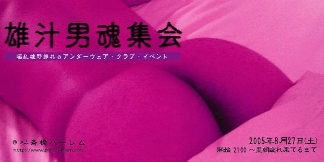 *淫乱雄野郎共のアンダーウェア・クラブ・イベント ■2005年8月27日(土) Door: 21:00 〜 翌朝疲れ果てるまで ■会費: ¥2,000 (1ドリンク & Free Rush & moreノ) ■スタイル:アンダーウェア (特にボクサータイプ歓迎!) 競パン、ケツ割れ、もしくは、全裸大歓迎!! (全裸の方、ドリンクチケット進呈) *トランクス等の緩い下着類は、禁止。 (アンダーウェアのご用意はしておりませんので、イベントの趣旨にそぐわない下着の方は、全裸で お願いします。) ■ ラッシュ、オイル、コンドームすべてF