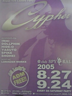 2005・8月27日(SAT)open 21:00〜 ALL NIGHT Lady`s 入場無料 Men‘s 1500-1D (TIME Discount21:00〜24:00\1,000-1D) ResidentsDjs IMAI DOLLPHIN HIDE−O YASUTO SPIKE SYOHEI HostMC LORIZER WORKS 枚方SPYRALでBran New Luxury Party``Cypher``が8月からスタートします。 毎月第4土曜日で他にはない演出、仕掛けで楽しめるパーティーです。 8月27日は第一回目ということでレセプションパーティーとして、シャン
