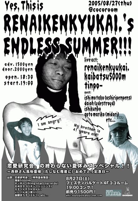 関西アンダーグラウンドの要人が揃ってどうでもいいことをする企画といえば恋愛研究会。! フジロックミュージシャンから芸人、ホイチョイ直撃世代サラリーマンまでが集い、どうでもいいことに適当に取り組み続ける「関西アンダーグラウンド界のたけし軍団」こと恋愛研究会。による来ても来なくても後悔する恒例の企画! 今回の共演者はフライングスタートレコードの隠し球、「チンポー」と、殺害オムニバスにも参加のストロングスタイル音楽ユニット、「海抜5000m」! さらに、10月に企画中のビッグなイベントに向けての前哨戦として、出