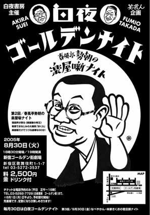 白夜書房主催 笑芸人企画 白夜ゴールデンナイト 「第2回 春風亭勢朝の楽屋噺ナイト」 落語界が誇る≪楽屋噺の帝王≫ 寄席でおなじみの大爆笑「まくら」 楽屋噺だけでつづる豪華な90分! 日時 2005年8月30日(火) 18時30分開場/19時開演 ※一部広告媒体で間違った開演時間が明記されておりましたので ご注意下さい。 場所 新宿ゴールデン街劇場 新宿区歌舞伎町1-1-7 TEL 03-5272-3537 劇場ホームページ http://www.geocities.jp/golden_gai_gekijou/ 料金 2,500円(ドリンク付) チケットは電話予約のみ【正午〜1