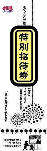HUBなんば戎橋店では、今月の30日(火)31日(水)に エヴィス ハブ祭を開催します! 内容 ・射的で割引券が当たります! ・スーパーボールすくいでいっぱいGETしたら、やっぱり割引券がもらえます!! ・カキ氷を販売しますっ! ・2日間限定カクテルも販売しちゃいますっっ! ・さらには、浴衣コンテストもやっちゃいますよっ! この特別招待券を載せておきます! 必ず印刷して持ってきてください! 「見ました」じゃダメだそうです。(店長曰く) お手数ですけど、よろしくお願いします。 射的またはスーパーボールすくいを