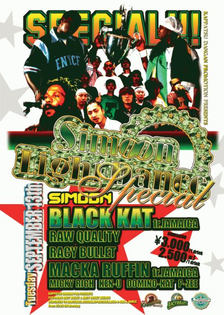 every tuesday SIMOON LIGHT DANCE -SPECIAL GUEST SOUND- BLACK KAT fr.JAMAICA -sound- RACY BULLET RAW QUALITY -showcase- MACKA RUFFIN fr.JAMAICA MICKY RICH KEN-U DOMINO-KAT P-ZEE ADM 3000 1/D WF 2000 1/D http://ip.tosp.co.jp/i.asp?i=racybullet