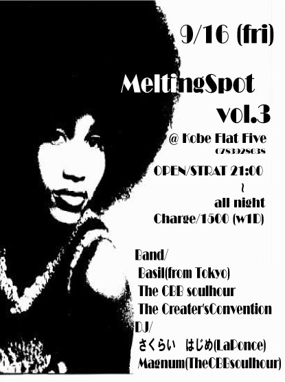書き込み失礼致します。またメール送ります!MIKI Funk,Soulをベースにゆったり、まったりやっていくイベント MeltingSpotがおしゃれなSPOT神戸FlatFiveにて行われます。 OPEN/START 21:00〜all night adv/door 1500(w1d) BAND BASIL/THE CBB SOULHOUR/ The Creator’s Convention DJ/さくらいはじめ(LaPonce):マグナム(TheCBBsoulhour) 前回に引き続きDJには、京都より さくらいはじめ君。 バンドでもでずっぱりなCBBのマグナム君を向かえ バンドにはSupperButterDogsの竹内氏がプロデュースしているPeaceな