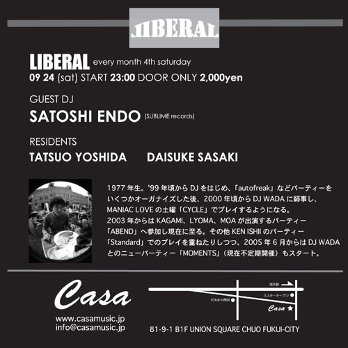 ・DJ SATOSHI ENDO (Sublime Records) 1977年生。'99年頃からDJをはじめ、「autofreak」などパーティーをいくつかオーガナイズした後、2000年頃からDJ WADAに師事し、MANIAC LOVEの土曜「CYCLE」でプレイするようになる。2003年からはKAGAMI、LYOMA、MOAが出演するパーティー「ABEND」へ参加し現在に至る。その他KEN ISHIIのパーティー「Standard」でのプレイを重ねたりしつつ、2005年6月からはDJ WADAとのニューパーティー「MOMENTS」(現在不定期開催)もスタート。 TATSUO YOSHIDA DAISUKE SASAKI door : 2000yen