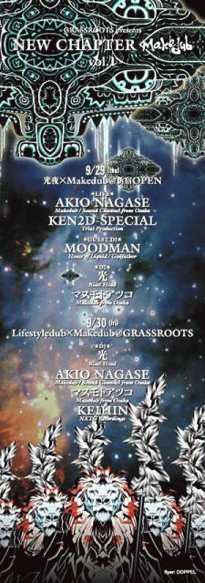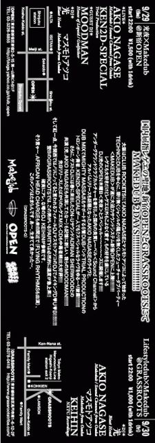 GRASSROOTS presents 「NEW CHAPTER Make dub vol.1」!!!! 9/29(thu) 「光夜」×「Make dub」@新宿OPEN LIVE AKIO NAGASE(Make dub) KEN2D−SPECIAL(Trial Production) GUEST DJ MOODMAN(House of liquid/Godfather) DJ 光(Blast head) マスモトアツコ(Make dub) 9/30(fri) Lifestyledub×Makedub@