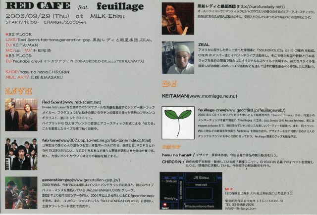 RED CAFE feat. feuillage 2005/09/29(Thu) @MILK start/18:00〜 CHAGE/2,500yen 1drink 今回、feuillage(毎月第四金曜三軒茶屋@Chrome )がB3フロアーにて盛り上げます!B2はLIVEメインです。 18時からということで学校、仕事帰りなど気軽に来て下さい!!よろしくお願いします!!