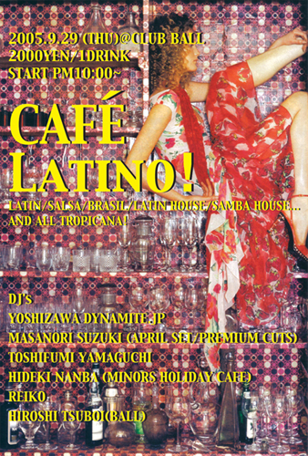 □□□□□ CAFE LATINO @ CLUB BALL □□□□□ 2005.09/29 (THU) 10:00 OPEN 200YEN/2D CLUB BALL 03-3476-6553 DJ:鈴木雅尭、吉沢ダイナマイト.jp、山口要文、南場 秀樹、REIKO & 坪井洋(BALL) 「PREMIUM CUTS」の鈴木雅尭と「LATIN EXERCISE」 の吉沢ダイナマイト.jpが贈る、ポップでカラフルで ファンタスティックなニュー・トロピカル・アミュー ズメント! という訳で前からずっとトライしたかったラテン系 ニュー・パーティーです。ぜひ遊びに来てください! LATIN/SALSA/BRAZIL/LATIN HOUSE ETC. □□□□□ CAF