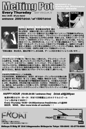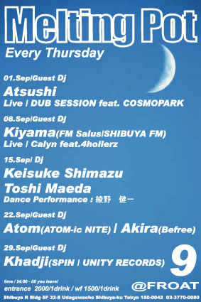今週の木曜日の"Melting pot"@FROATはGUEST DJに"DJ Khadji"氏(UNITY Records)を迎えてお贈りしたいと思います。 UNITY Recordsの敏腕A&Rとしても、又、来月にN.Y.にDJ行きも決まっている"DJ Khadji"氏と久々に一緒に回す機会が出来て,嬉しく思っております。 又、今週の木曜日はFROATの"森ちゃん"こと、森田氏のお誕生日なので、 皆さんと一緒にお祝いしたいと思っております。 お時間、ご都合が宜しければ、今週木曜日、是非遊びにいらして下さい。 24:00までは"HAPPY HOUR"!!エントランスフリーでしかも、ドリンク 1杯¥30