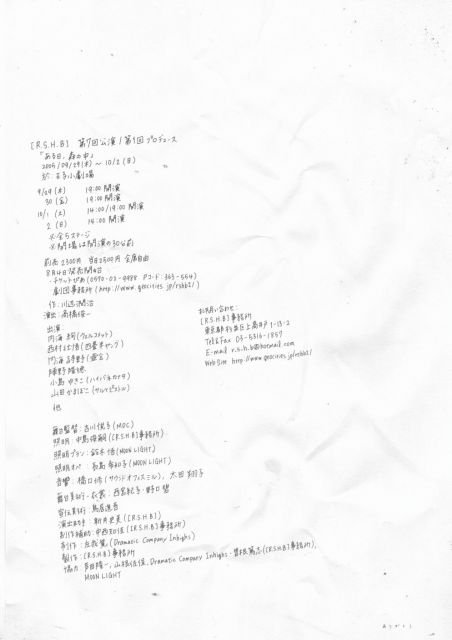 公演情報のお知らせです。 興味ありましたらメッセージ下さい。 チケットもメッセージ頂けましたら、 取り置きさせて頂きます。 またサイトにも気軽に遊びに来てください。 よろしくお願い致します。 山の奥の不法投棄場。 ゴミに紛れて一人の女。 女は精神を病んでいた。 ゴミに塗れて現れた男。 男は肉体を病んでいた。 二人の目的は再生。 ある日、森の中。 出会う、ふたり。 [R.S.H.B] 第7回公演/第1回プロデュース 「ある日、森の中」 2005/09/29(木)〜10/2(日) 於:王子小劇場 9/29(