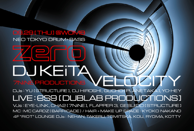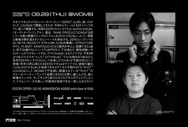 RESIDENT DJs:: DJ KEiTA (7NiNE PRODUCTIONS) VELOCITY (7NiNE PRODUCTIONS) SPECIAL LIVE:: es9 (DUBLAB PRODUCTIONS) DJs:: YU (STRUCTURE) DJ HIROSHI GUCHO (PLANET AKA) YO-HEY VJs:: EYE-LINK (7NiNE PRODUCTIONS) CHA2 (7NiNE PRODUCTIONS) FLAPPER 3 GESUIDO (STRUCTURE) MC:: MC CARDZ (BARRICADE) 4F "RIOT" LOUNGE DJs:: NEHAN TAKERU TOMITSKA KOU RYOMA KOTTY HAIR + MAKE UP SPACE:: KYOKO NAKANO (阿E.) ネオ・トウキョウ・ドラムンベースパーティー "ZERO"。2ヵ月に渡って4F V.I.P. LOUNGEで