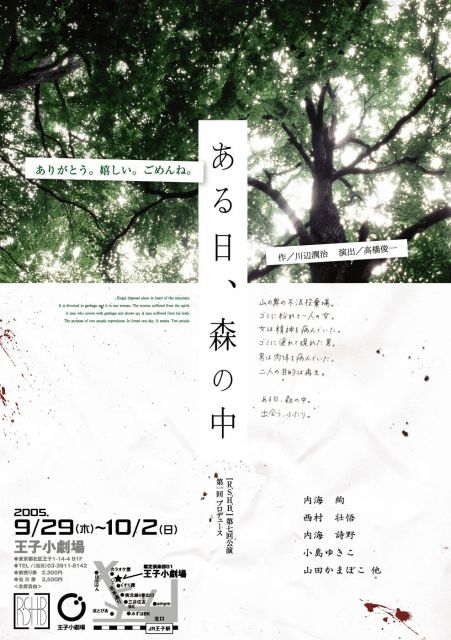 山の奥の不法投棄場。 ゴミに紛れて一人の女。 女は精神を病んでいた。 ゴミに塗れて現れた男。 男は肉体を病んでいた。 二人の目的は再生。 ある日、森の中。 出会う、ふたり。 [R.S.H.B] 第7回公演/第1回プロデュース 「ある日、森の中」 2005/09/29(木)〜10/2(日) 於:王子小劇場 9/29(木) 19:00開演 30(金) 19:00開演 10/1(土) 14:00/19:00開演 2(日) 14:00開演 ※全5ステージ ※会場は開演の30分前 前売2300円 当日2500円 全