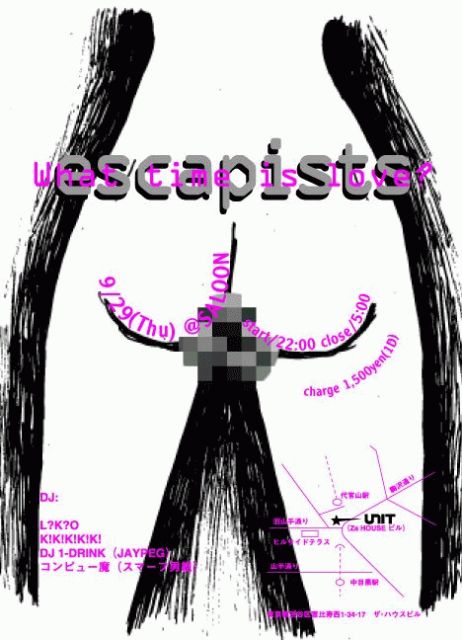 ≪Why Sheep?より皆様へ≫ 今週木曜9/29、 代官山UNITの地下ラウンジ、Saloon第五木曜日定例 (といってもまだ二回目ですが) "escapists"開催です。 当初のコンセプトどおりハイプな代官山で クロウト好みの音を提供してゆきます。 ゲストにはイルドーザーで知られ現JAYPEGから1DRINK。 そして敬愛するコンピューマ。 もちろんレジデントのL?K?OとK!K!K!K!K!も健在です。 ところで今回、私自身は韓国公演の日程と どうしても調整がきかず不参加となってしまいました。 大変申し訳ありません。 が、が、本当に厳選されたラインナッ