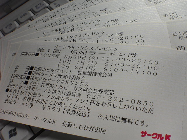 趣旨: 9/30・10/1・2と3日に渡って、長野市ビックハット駐車場で行われる県内有名ラーメン店による博覧会 (http://www.ramenhaku.jp/) こんなお馬鹿企画に便乗して、Mixiユーザー集まってみようぜなんて考えてみました。ようは『暇人集まってみんなでラーメン食おうぜ企画』です。 日時: 10/1の12:00ぐらい 10/2の12:00ぐらい (9/30は仕事で行けないかもしれないのでナシで) 集合場所: 南側(臨時駐車場側)『チケット販売&総合インフォメーション』の前付近。お店で言うと「まとや」側。 な