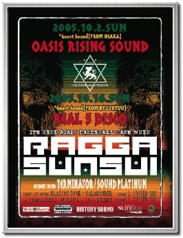 大阪のビッグ・コミュニティー・ダンス [RAGGA sunsui] [日時] 10月2日(日) START 22:00 [SOUND] TERMINATOR SOUND PLATINUM GEUEST : OASIS RISING SOUND BLAZING TONE/SALAMANDER [価格] 当日 男性 ¥2,000− 女性 ¥1,000− (共にドリンク代別途) ※ RAGGA sunsuiではメールにてお得なディスカウント情報を配信しております。ragga@sunsui.netに携帯からメール