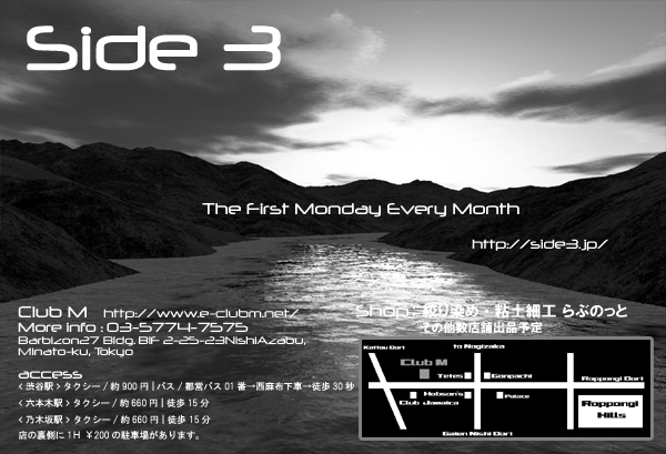 ◆Side3◆ @Club M [NishiAzabu] ?03-5774-7575 Barbizon27 Bldg.B1F 2-25-23 NishiAzabu Minato-ku Tokyo http://e-clubm.net/ 2005.10.03[mon] ※毎月第一月曜日 OPEN/START 23:00 FEE: Doors/\2,500 [1drink] With Flyer/\2,000 [1drink] Web discount/\2,000 [1drink] MAIN STAGE DJs: CARULA COZY [D'2-project/METAPHORM] MAKOTO UEKKIE E'z=kA FUTURE STAGE DJs: 久高 将史 [Re.creation] O.S.S [Re.creation] Dora-uchi [Re.creation] KENTARO [4D] TAKUMA [4D] VJ:Drug'on