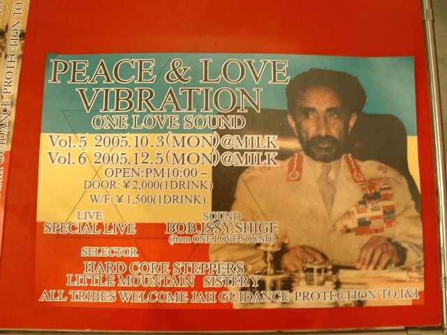 ★★★★★PEACE&LOVE VIBRATION VO5★★★★★ 2005,10,3 AT 恵比寿MILK ★OPEN PM10:00〜 DOOR \2000 W/F \1500 <LIVE> ★だんばだんば <SOUND> ★ONE LOVE SOUND <SELECTOR> ★HARD CORE STEPPERS ★LITTLE MOUNTAIN ★SISTER Y <SHOP> ★marilyn brooklynhttp://mixi.jp/show_friend.pl?id=387510 ★FUNKY MONKShttp://mixi.jp/show_friend.pl?id=849848 ★L,O,K ★JAPANESE JAH MESSENGERたちが「平和、愛、融和をROOTS ROCK REGGAEで表現し続ける"PEACE&LOVE VIBRATIN" 恵比