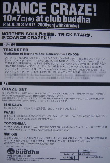 10月7日(金)名古屋で歴史のあるMod&60'sイベントで TricksterがゲストDJすることになりました。 Northern Soulに興味がある方々、 是非、足をお運びくださるよう、よろしくお願いします。 詳細は以下、チェックしてください。 ●DANCE CRAZE!@CLUB BUDDHA http://www.dance-craze.com 9pm〜ALLNIGHTER, \2,000- (2DRINK) ●DJ's ISHIKAWA, IWAKI, 豊島, 服部 心湖 ●Guest DJ TRICKSTER (from London) ●CLUB BUDDHA http://www.clubbuddha.com/b_about.html 名古屋市中区新栄1-5-25 第2Mビル6F 052-251-5450