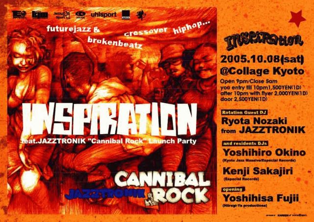 10月8日(土) 「inspiration feat.JAZZTRONIK"Cannibal Rock"Launch Party」 場所:京都COLLAGE (京都市中京区西木屋町四条上る紙屋町336レイホウ会館2F) 時間:午後9時〜午前5時 料金:当日¥2,500(1ドリンク) 午後10時までに御入場の方¥1,500(1ドリンク) 午後10時以降フライヤーご持参の方\2,000(1ドリンク) mixi招待(inspirationのコミュニティに入って頂いている方)\2,000(1ドリンク) [Rotation Guest DJ] Ryota Nozaki from JAZZTRONIK 自由なスタイルのプロジェクト"JAZZTRONIK"を主宰し、イン