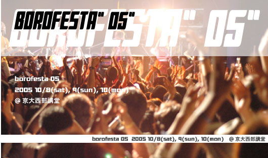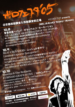 【日程】10月8日(土)、9日(日)、10日(月・祝) 【会場】京大西部講堂、西部講堂前広場 【時間】開場/開演13:00(終演21:00) 【料金】1日券:前売り¥3,500- 3日通し券:¥8,000-(100枚限定) (前売り・当日・通し券ともに別途ドリンク代500円) チケットはぴあ・ローソン・nishiki-yaHPにて発売中 【出演】 8日 曽我部恵一バンド、ギターウルフ、カーネーション、ZUINOSIN、 NATSUMEN、LABCRY、COALTAR OF THE DEEPERS、 THE 5.6.7.8's、super noah、 ゆーきゃん meets あ