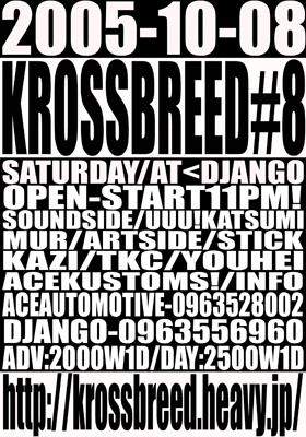 今回で8回目を迎えるKROSS BREEDが場所をDjangoに移し爆発します!熊本のジェネラルエレクトロニクスダンスミュージックシーンとLowBrowArtシーンを融合し、常に新しい実験を試み、熊本から全世界に向けて発信するSOUNDを是非体感して頂戴!ゲストを呼ばなきゃ客が入らないEast Sideとは、一味も二味も違う空間を味わう必要性はかなり重要!!Don't Miss it!!!!!