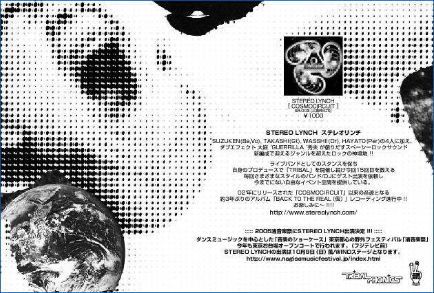 今回で「TRIBAL」も15回目!! 微妙に区切りのいい今回は...!! STEREO LYNCHロングセットでのライブを予定してます!! いやぁ〜楽しみですねぇ。 さらにQUO,TAUNOIAとの共演ですっ!! 「良い音楽、良い酒、良いヴァイヴ」 みなさんTRIBALに遊びに行きましょう〜!! 「TRIBAL vol.15」 STEREOLYNCH QUO TAUNOIA DJ SHIN-G open 18:30 / start 19:00 advance 1700yen / door 2000yen +1drink 500yen info HEAVEN'SDOOR 0334109581