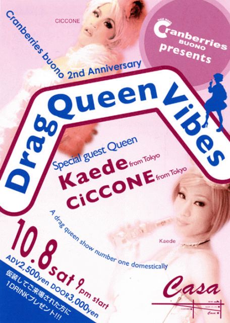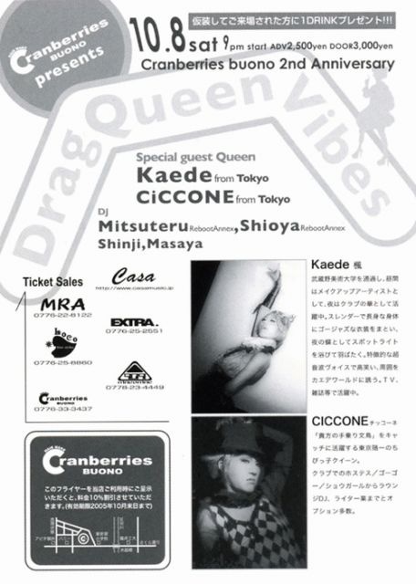 Cranberries buono 2nd Anniversary DragQueenVibes AVD 2500円 DOOR 3000円 仮装してご来場された方に1DRINKプレゼント!! Special Guest Queen Kaede from Tokyo CiCCONE from Tokyo DJ MITSUTERU(REBOOT ANNEX) SHIOYA(REBOOT ANNEX) Shinji,Masaya