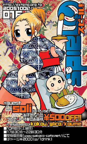 次回はglico vs soli!!!暑さも去って少し過ごしやすくなる10月。7月のIn-PulseでResidentとして競演したSoli君とglicoの好カードが実現します!!。誰もが燃えるあつい展開必至。しかし今回の遊びは『お子さんへのプレゼント』割引!1歳半になるSoli君のお子さんへのプレゼントを持ってくると500OFF!!なんてほのぼの企画。熱いの?ゆるいの?もちろん、楽しいんです!!。楽しみに来てください。よろしくお願いいたします。