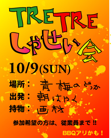 場所:青梅のどこか 出発:朝はやく 持物:画材 参加希望の方は、従業員まで。 BBQもアリかも!