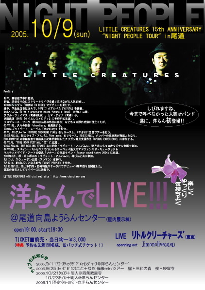 Little Creatures 15th Anniversary "Night People Tour" 開催日時: 10/9 19:00open,start 場所:尾道向島洋らんセンター 屋内展示棟 openning act: jimono live(尾道) Live:Little Creatures 料金:¥3,000 (adv/door,予約先着150名缶バッヂチケット) お問合せ:信恵(090-1336-4757) nobue03271959@n.vodafone.ne.jp 向島洋らんセンター 西条franc's082-421-5896