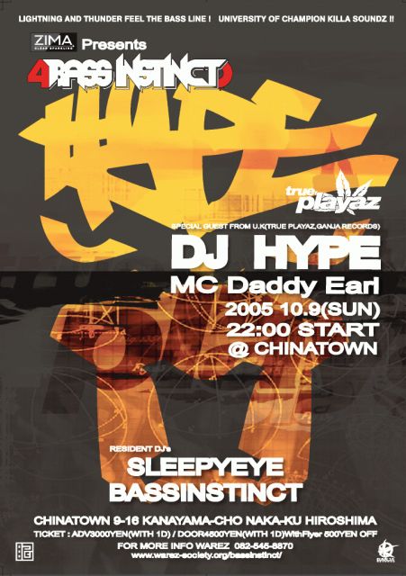 ■■■BASSINSTINCT feat.DJ HYPE & DADDY EARL■■■ 2005.10.9(SUN)START22:00 @CHINATOWN SPECIAL GUEST: DJ HYPE(TRUE PLAYAZ,GANJA RECORDS),MC DADDY EARL RESIDENT DJ: BASSINSTINCT CRU,SLEEPYEYE 【【【ドラムンベース界のターンテーブルマジシャン"DJ HYPE"登場!】】】 3台のターンテーブル、バトルDJ仕込みのスクラッチ...まさに予期不能のグルーヴを生み出す彼のプレイは決して見逃せない!! そして今回のパートナーは、'04にDJ HYPEがリリースした「DUBPLATE KILLER」シリーズでフィーチャーされ話題の"MC