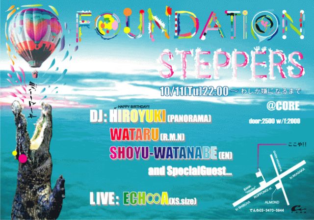 『友人たちよ、友人などいないのだ。』 〜アリストテレス --- 10.11 tue 22:00〜ワシが嫌になるまで "Foundation Steppers" -HIROYUKI BIRTHDAY SPECIAL!!!- @CORE http://www.clubcore.net/ dj: HIROYUKI(PANORAMA) WATARU(R.M.N) SYO-YU WATANABE(EN) live: ECHOA(XS.size)