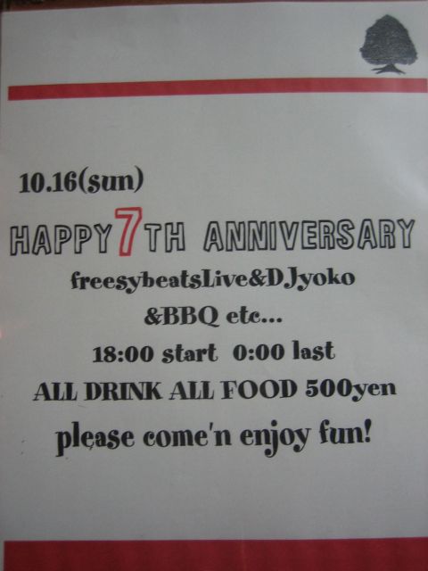 Double Doorsの7th Anniversaryですよーー スタッフは盛大なパーティーになるよう色々考えてるみたいですよ☆ 何か楽しいアイディアあったらドシドシ受け付けますとByスタッフ Freeasy Beats & DJyoko のライブもあるそうです! これは必見ですよーーーー 時間は 18〜24時 ドリンク、FOOD全部500円 FOODはBBQスタイル+他メニュー 常連さんも、初めての方も是非!!