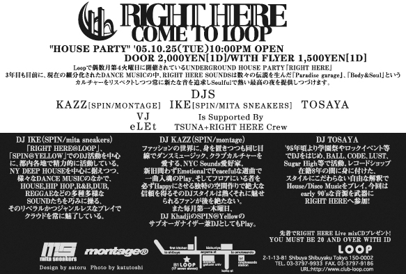 3年目も目前に、細分化されたDANCE MUSICの中、RIGHT HEREは数々の伝説を生んだ『Paradise garage』『Body&Soul』というスピリッツ、カルチャーをリスペクトしつつ常に新たな音を追求しSoulfulで熱い最高の夜を提供し続けます。