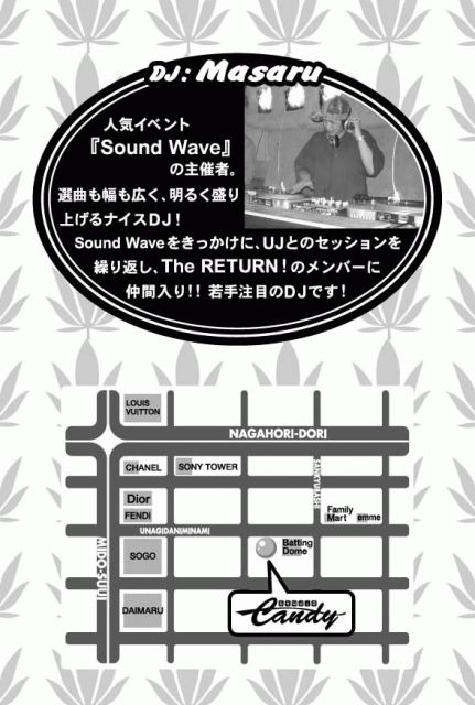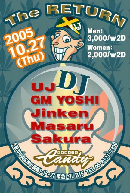 2005/10/27(Thu) The RETURN!@studioCANDY men:\3000/w2drink women:\2000/w2drink DJ:UJ GM YOSHI Jinken Masaru Sakura 今回はDJオンリーでみっちりいきま〜す! どんどん、参加してください!!