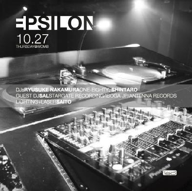 EPSILON 2005.10.27 THU open 22:00 【PROGRESSIVE HOUSE】 DOOR 2,500yen WITH FLYER 2,000yen/WOMB MEMBER 1,500yen --------------------------------------------------------- DJs RYUSUKE NAKAMURA (ONE-EIGHTY) SHINTARO GUEST DJ SAL (STARGATE REC./IBOGA/ANTENNA RECORDS) LIGHTING-LASER SAITO --------------------------------------------------------- FOOD BATHTUB MASSAGE YUMI KOZUE JUNKO -------------------------------------