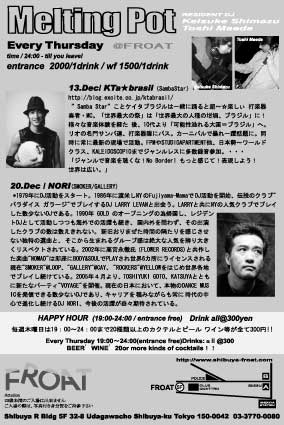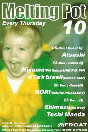 毎週(木)、"Melting Pot"@FROAT!! 今週はレジデントDJの僕と島津さんのロングセットです。 先週、先々週と木山さん、KTa★brasil、NORIさんと豪華なGUEST DJ方を 迎えてお贈りしましたが、今週も熱い日にします!! さらに、今週は"DJ Toy"君が"Melting Pot"に初参戦! センスの良い彼のPLAYに期待しています。 (Toy君ヨロシクね〜。) "Melting Pot" - every thursday / 24:00 start - MUSIC : TOSHI MAEDA & KEISUKE SHIMAZU (Befree) ADMISSION FEE : \2000 with 1drink(W/F¥1500/1D) HAPPY HOUR(19:00-24