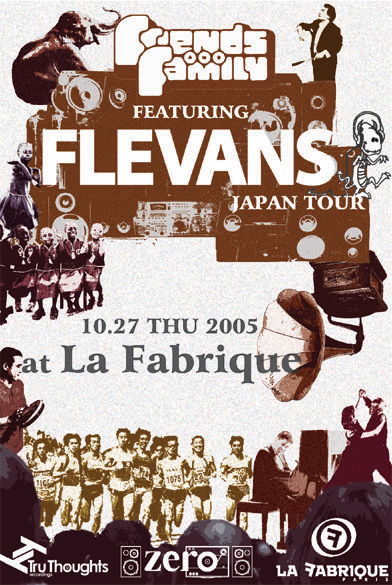 Friends & Familyの第二弾"Flevans Japn Tour" が10/27東京La Fbriqueにて行われます。 つきましてはMixiで当イベントのディスカウントを行いたいと思います。 通常Door3000円のところ2000円にてお待ちしております。 来場予定の方はこのイベントに人数とお名前をお書きください。 10/27(Thu) Friends & Family Tokyo[Autumn 2005] @ La Fabrique Guest:Flevans(Tru Thoughts) DJs :RfDM,sawataishi,Jinn,Dope Dogs Yuki Kuroda,NORIKO,SATOSHI www.flevans.co.uk / www.tru-thoughts.co.uk UK Brightonをベースに