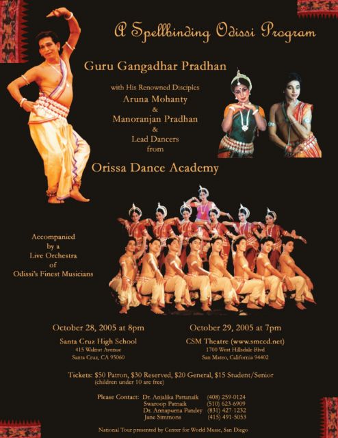 Orissa Dance Academy, founded by Guru Gangadhar Pradhan, performs in Santa Cruz on October 28th and in the Bay Area on October 29th. The Odissi troupe features Guru Gangadhar Pradhan, leading Odissi dancers Aruna Mohanty and Manaranjan Pradhan (who has performed and taught in the Bay Area several times), an outstanding group of dancers, includin