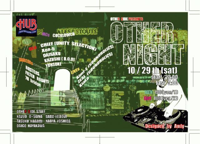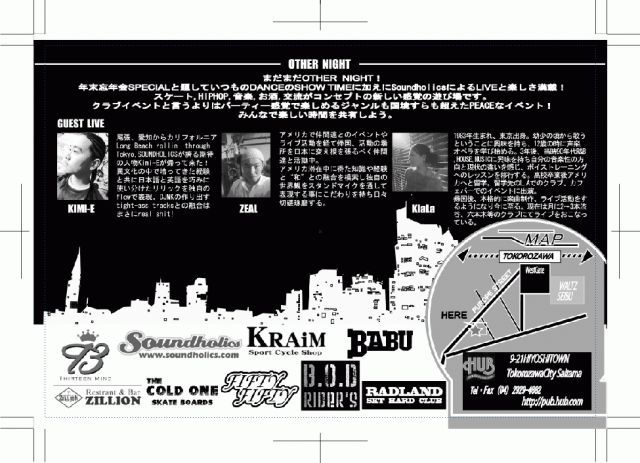まだまだOTHER NIGHT! 年末忘年会SPECIALと題していつものDANCEのSHOW TIMEに加えにSoundholicsによるLIVEと楽しさ満載! スケート,HIPHOP,音楽,お酒,交流がコンセプトの新しい感覚の遊び場です。 クラブイベントと言うよりはパーティー感覚で楽しめるジャンルも国境すらも超えたPEACEなイベント! みんなで楽しい時間を共有しよう。 場所は西武新宿&池袋線の交差する所沢駅 西口を出て右にプロペ通りを歩いて商店街の真ん中位の所。 カラオケ館の手前のビルを地下に入ります。 MC COCKLOWCH DJ CHIEF(UNITY SELECTION) KE