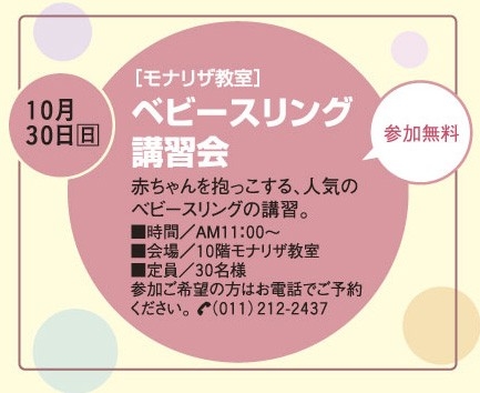 あかちゃんも安心、ママも楽ちん オシャレな抱っこ紐「ベビー用スリング」の講習会を開催します。 使い方の実演と,スリングの中でも,つけ心地抜群のa-issoのスリング販売も行います。 参加は無料ですが、30名限定です。 申込、お問合せはさっぽろ東急百貨店011-212-2437 持っているけれど使い方が分からない方、買おうかどうしようか迷っているあなたも是非ご参加下さい 入場は無料です(予約が必要)